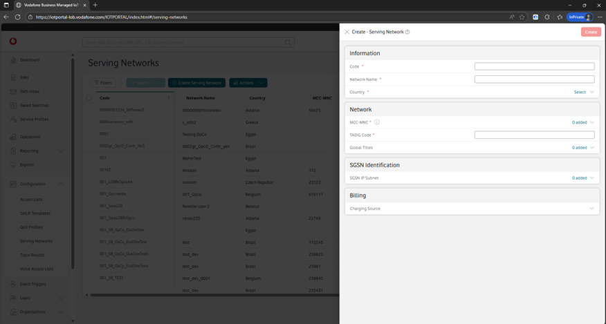 Users with the required authorisation permissions can create a serving network – or radio network used to access Vodafone’s IoT Services – within the Vodafone Business Managed IoT Connectivity Platform.