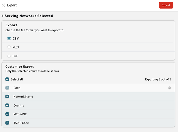 You can export the details of a serving network – or radio network used to access Vodafone’s IoT Services – within the Vodafone Business Managed IoT Connectivity Platform, as long as you have the required authorisation level.