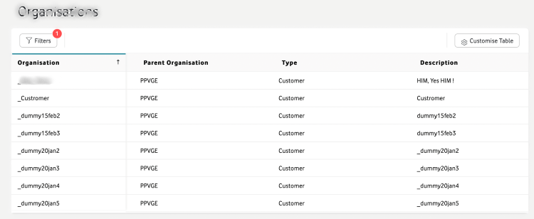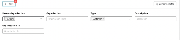 Another way to control the information presented in the Organisations List is by selecting or deselecting the columns shown using the Customise Table tab in the top right corner.