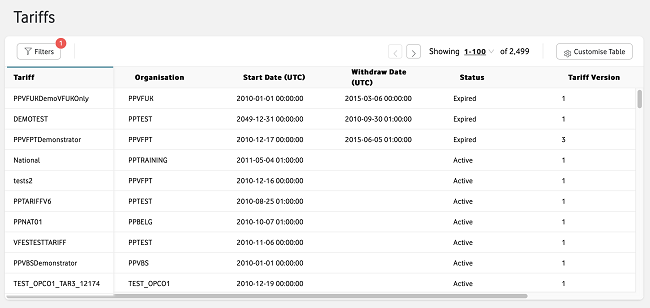 You will then be taken to the Tariff Management section, where you can search for all the tariffs available to your organisation and any linked organisations. If required, you can also select Export to export information about tariffs to share outside the platform.