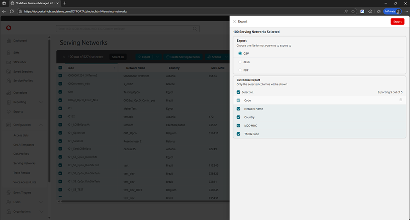 To export a list of serving networks, select the serving networks required and select Export to open the Export window where you can choose the file format (CSV, XLSX, or PDF) and further customise the list using the filters below.